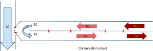 چیدمان چند مسیره شامل مسیرهای متصل شده بهشکل سری هستند که در شکل زیر چیدمان شکل بندی با دو مسیر و سه یا چهار کانال نمایش میدهند که باختصار آن را یا مینامند. این سیستم بجز صفحه مرکزی که در آن جریان هم جهت روان است دارای جریان مخالف جهت است.