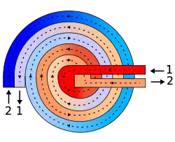 شکل زیر سیستم جریان دو مسیر –یک مسیر (شکل بندی نوع ۱/۲) را نشان میدهد که در آن یک سیال در مسیر خط چین و سیال دیگر در دو مسیر خط توپر جریان دارد. در این نوع چیدمان نیمی از مبدل دارای جریان مخالف و نصف دیگر دارای جریان هم جهت است که از آن به عنوان سیستم نامتقارن نام برده میشود و اگر یکی از سیالهای مورد استفاده دارای دبی حجمی بزرگتر از دیگری یا افت فشار مجاز کوچکتر از جریان دیگر باشد مورد استفاده قرار میگیرد.