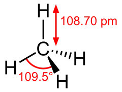 در مولکول متان یک اتم کربن در وسط و 4 اتم هیدروژن دور آن با زاویۀ قرار دارد. انگار اتم کربن مرکز یک چهاروجهی منتظم است و اتم های هیدروژن رئوس آن هستند.