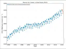 متان موجود در جو یا متان اتمسفری یکی از گازهای قوی و بانفوذ گلخانهای است که میزان آن وابسته به تغییرات اقلیمی است. مقدار پتانسیل گرمایش جهانی[پ 1] (GWP) متان در ۱۰۰ سال حدود ۲۵ GWP است، این بدان معنی است که متان در طی یک دوره ۱۰۰ ساله، ۲۵ بار گرمای بیشتری در واحد جرم، نسبت به دیاکسید کربن را به دام میاندازد. غلظت متان زمین از سال ۱۷۵۰ تاکنون حدود ۱۵۰ درصد افزایش یافتهاست.