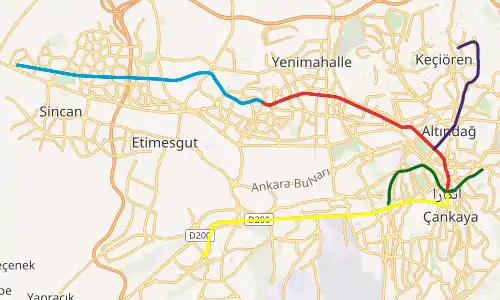 خط متروی آنکارای هماکنون دارای ۱۱ ایستگاه میباشد. این خط محله دیکیماوی را به ترمینال مسافری بین شهری آنکارا موسوم به آشتی متصل میکند. ایستگاههای مسیر از سمت دیکیماوی به آشتی عبارتند از کورتولوش، کالج، قیزیلآی، دمیرتپه، مالتپه، تاندوغان، بشاِولِر، باغچهلی اِولِر و اِمِک