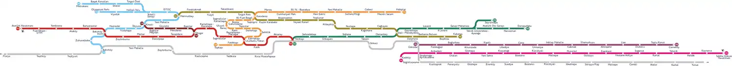 | ام۳ | Kirazlı ↔ Metrokent–Olimpiyat | ۲۰۱۳[7] | 15.9 km[7] | ۱۱[7] | A southern extension (9.0 km to Bakırköy, with 7 stations) is under construction. Operates from 06:00 a.m. to 00.00 a.m. | |