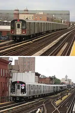 ![]() Top: A 6 train made up of R142A cars enters the Parkchester station. Bottom: An E train made up of R160A cars waits for passengers at the 42nd Street – Port Authority Bus Terminal station. | |||