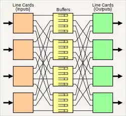 هر کارت خط ورودی بسته های خود را به طور مساوی به بافرهای N پخش می کند ، کاری که به وضوح می تواند بدون مجادله انجام دهد. هر بافر این بسته ها را در یک بافرِ حافظه محلی واحد با نرخ ترکیبی R می نویسد. همزمان ، هر بافر بسته هایی را در بالای هر صف خروجی مجازی به هر کارت خط خروجی با نرخ R / N به هر کارت می فرستد. کارت خط خروجی به وضوح می تواند این بسته ها را بدون هیچ گونه مشاجره از خط خارج کند.