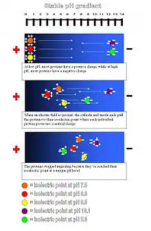 همانطور که گفته شد، پروتئینی که در PH کمتر از نقطه ایزوالکتریک خود میباشد دارای بار مثبت میباشد و از این رو به سمت کاتد (الکترود با بار منفی) حرکت خواهد نمود. هنگامی که پروتئین در یک شیب افزایشی PH مهاجرت میکند، بار کلی پروتئین کاهش خواهد یافت تا اینکه به یک ناحیه ای میرسد که در ان PH با نقطه ایزوالکتریک آن پروتئین برابر است. در این نقطه پروتئین به دلیل نداشتن بار در میدان الکتریکی متوقف خواهد شد (در واقع منطقه ایزوالکتریک هر پروتئین مانند اثر انگشت آن میباشد و هر پروتئین در ناحیه ای از PH که با نقطه ایزوالکتریک آن برابر است، متوقف خواهد شد و تشکیل باند خواهد داد)