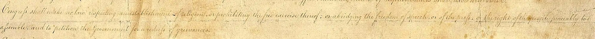 - «کنگره در خصوص رسمیت بخشیدن به یک دین، یا منع پیروی آزادانه از آن یا محدود ساختن آزادی بیان یا مطبوعات یا حق مردم برای برپایی اجتماعات آرام و دادخواهی از حکومت برای جبران خسارت، هیچ قانونی را وضع نمیکند.»