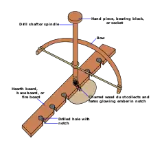 روش کار: هنگامی که کمان به جلو و عقب حرکت داده میشود تسمه کمان دور چوب میپیچد و آن را به حرکت درمیآورد. نوک مته روی پایهای چوبی قرار میگیرد. مالش مته روی پایه گرما ایجاد میکند و این گرما پوشال آتشگیر را که روی پایه گذاشته میشود مشتعل میسازد. سپس این توده آتشگیر به تودهای از گیاهان خشک و هیزم افزوده میشود. بشر ماقبل تاریخ برای مستقیم نگه داشتن مته از سنگ یا قطعهای چوب در قسمت بالای کمان استفاده میکرد. برخی از یک دهانگیر چوبی برای نگه داشتن مته استفاده میکردند تا دست دیگرشان برای نگه داشتن پایه آزاد باشد.[1]