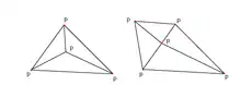 تثلیث دیلانی در فضای گسسته مجموعه p در جنرال پوزیشن مربوط به گرافهای دوگانه از دیاگرام ورونی از مجموعه p. موردهای خاصی که شامل سه نقطهای که روی یک خط اند و چهار نقطهای که روی یک دایرهاند.