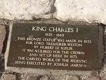 مجسمه چارلز اول پادشاه انگلستان را سوار بر اسب، با پوشش زره و چکمه و بدون کلاهخود نشان میدهد که یک عصا در دست راست خود دارد.