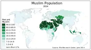 ![]() The Muslim population of the world map by percentage of each country, according to the Pew Forum (assessed in 29 June 2014). | |