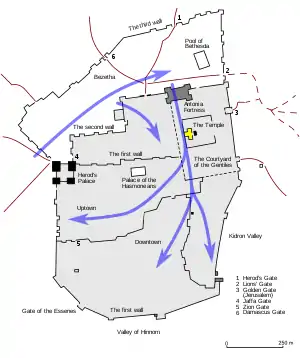 - War of the Jews Book V, sect. 99 (Ch. 3, paragraph 1 in Whiston's translation); dates given are approximations since the correspondence between the calendar Josephus used and modern calendars is uncertain.