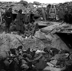 ![]() سربازان روس بر بالای سنگری از اجساد ژاپنیها ایستادهاند. | |||||||