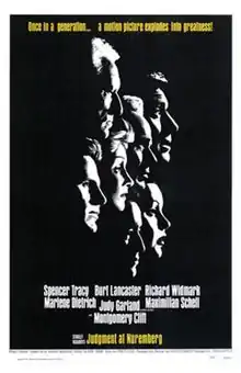 قضاوت در نورنبرگ (به انگلیسی: Judgment at Nuremberg) فیلمی درام حقوقی به کارگردانی استنلی کریمر با بازی اسپنسر تریسی است.[3] داستان فیلم در مورد محاکمه تعدادی از قضات آلمان نازی است که دادگاه آنها در ادامه دادگاه نورنبرگ تشکیل شد.[4] فیلم نامزد یازده جایزه اسکار بود که توانست در دو بخش فیلمنامه اقتباسی برای ابی مان و بهترین بازیگر نقش اول مرد برای ماکسیمیلیان شل، توفیق کسب کند.