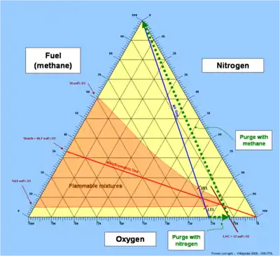 - این مسئله کاربرد مهمی در مهندسی ایمنی و آتش دارد. به عنوان مثال، برای اینکه یک ظرف جدید یا یک مخزن تحت فشار با گازهای قابل اشتعال پر کنیم، فضای هوای معمولی (حاوی حدود ۲۱ درصد حجم اکسیژن است) در مخزن ابتدا باید با نیتروژن یا یکی دیگر از گاز خنثی غیرقابل اشتعال جریان یابد، در نتیجه کاهش غلظت اکسیژن در داخل ظرف را به دنبال دارد. هنگامی که غلظت اکسیژن کمتر از غلظت اکسیژن پایین است -گاز قابل اشتعال به دلیل اینکه انفجار داخلی از بین رفته است میتواند به راحتی در مخزن جاری شود.
