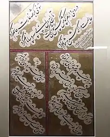 - کتابت شعر بر روی یکی از درب شاهچراغ که هماکنون در موزه شاهچراغ نگهداری میشود. درتاریخ ۱۲۵۱ خورشیدی.