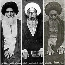 میرزا حسین نائینی، شیخ الاسلام محمدحسین نائینی زاده ۲۶ خرداد ۱۲۳۹ (۲۷ ذیقعده ۱۲۷۶ قمری) در نائین[1] - درگذشته ۲۳ مرداد ۱۳۱۵ (۲۶ جمادیالاول ۱۳۵۵ قمری) در نجف مرجع تقلید شیعه بود که بعد از درگذشت فتحالله غروی اصفهانی، مرجعیت عامه شیعه را بر عهده داشت. او با نوشتن رسالهٔ تنبیهالامه و تنزیهالمله نقش مهمی در تثبیتِ نظری جنبش مشروطه انجام داد.