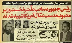 - «رجایی و باهنر در انفجار دفتر نخستوزیری به شهادت رسیدند». تاریخ ایرانی. دریافتشده در ۸ شهریور ۱۳۹۱.