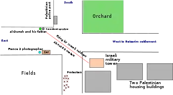 تصاویر تلویزیونی محمد وحشت زده و پدرش جمال را نشان میداد[2] که برای فرار از شلیک نظامیان در کنار دیوار و پشت بشکهای پناه گرفتهاند و پدر مدام علامت میداد که پسر کوچکش را نکشند اما لحظاتی بعد محمد کشته شد و فیلم پسر را بی حرکت نشان میداد.