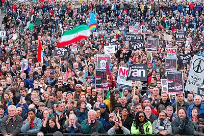 - مشارکتکنندگان ویکیپدیا. «Opposition to military action against Iran». در دانشنامهٔ ویکیپدیای انگلیسی، بازبینیشده در ۲۵ مه ۲۰۱۶.