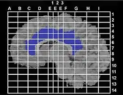 نمای ساژیتال از «ناحیهٔ سینگولیت» مغز که بر روی آن، مختصات تالیراک و نشانگرهای استانداردش انداخته شده است.