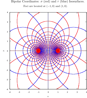 که در آن مختصات σ نقطهٔ P برابر زاویه F1 P F2 است، و مختصات τ آن برابر لگاریتم طبیعی نسبت فاصله d1 و d2 به کانون