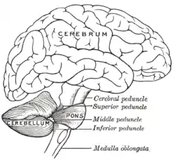 ![]() Drawing of the human brain, showing cerebellum and پل مغز | |