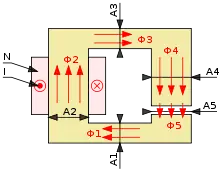 MMF به کار برده شده، جریان مغناطیسی را در طول اجزای مغناطیسی سیستم به حرکت در میآورد. جریان مغناطیسی در طول جزء مغناطیسی متناسب با تعداد خطوط میدان مغناطیسی میباشد که از عرض سطح مقطع آن جزء میگذرد. تعداد خطوط میدان مغناطیسی زمانی خالص میباشد که تعداد خطوطی که از یک جهت میگذرند از تعداد خطوطی که از جهت دیگر میگذرند، کم شود. جهت میدان مغناطیسی بردار B در درون آهنربا از قطب جنوب به قطب شمال میباشد. خارج از میدان خطوط از شمال به جنوب حرکت میکنند. جریانی که در طول یک جزء میدان بوده و نسبت به جهت میدان مغناطیسی عمودی میباشد. از حاصل ضرب میدان مغناطیسی و جزء میدان به دست میاید. به شکل سادهتر، جریان مغناطیسی Φ به طریق حاصلضرب عددی میدان مغناطیسی و بردار جزء میدان تعریف میشود. بهطور کمی، جریان مغناطیسی در طول سطح S به صورت میدان مغناطیسی سراسری در طول میدان مغناطیسی سطح مذکور تعریف میشود.