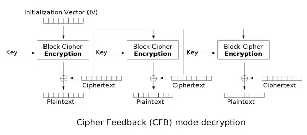 مد بازخورد رمز (CFB) بسیار شبیه CBC است، یک قطعه رمزگذاری را به یک رمزگذاری جریانی[6] خود-همگامساز تبدیل میکند. عملگر نیز بسیار شبیهاست، در واقع رمزگذاری CFB را به عنوان رمزگذاری CBC برعکس میشناسد: