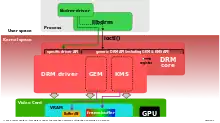 هسته DRM یک فریم ورک پایه را فراهم میکند که درایوهای DRMهای مختلف میتوانند ثبت شوند و همچنین یک فضای کاربر از حداقل مجموعه رایج ioctls را فراهم میکند. DRM هستهای را فراهم میکند چارچوب اساسی که در.[7] یک درایور DRM به عبارت دیگر بخشی از api وابستگی سختافزار را پیادهسازی میکند.