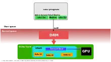 برنامههای فضای کاربری از APIهای DRM برای فرمان دادن به کارت گرافیک استفاده میکنند تا دستورها سختافزاری سه بعدی رندر، کدگشایی ویدئویی و محاسبات GPGPU را انجام دهد.