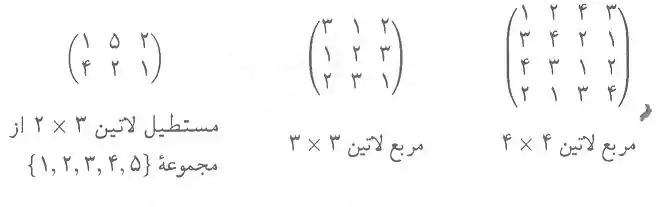 حال در مورد مستطیلها و مربعهایی بحث میکنیم که درایههای آن اعداد صحیح و مثبت هستند. یک مستطیل لاتین A با ابعاد p×q عبارت است از : یک ماتریس p × q که هر یک از درایههای آن عضو مجموعه {۳٬۲،1...n} بوده و هیچ عضو تکراری در سطر یا ستون آن به وجود نیاید. در حالت خاص اگر p = q = n آن را مربع لاتین مینامیم. در این صورت هر سطر و هر ستون جایگشتی از مجموعه {۳٬۲،1...n} است.
