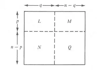 چون i به تعداد (L(i مرتبه در L ظاهر شده و P مرتبه در دو بخش M و L با هم ظاهر میشود. پس (p - L(i در M تکرار شدهاست. اما از طرفی i به تعداد n - q مرتبه در دو بخش Q و M با هم تکرار میشود. پس داریم: