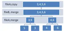 - و را به عنوان فایلهای ورودی در نظر میگیرد. هر بار، قطعات با شمارههای یکسان و را با یکدیگر ادغام میکند. حاصل هر ادغام قطعهای مرتب به طول است_ بجز قطعهٔ آخر که ممکن است طولش کمتر باشد_. این قطعات را یکبار در میان در و مینویسد.