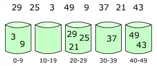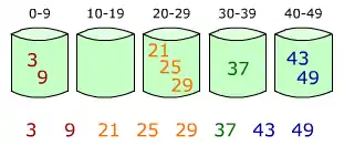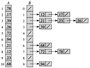 آرایه [A[1..10 داده شدهاست. آرایه [B[0..9 آرایهای از لیستهای مرتب شده یا سطلها پس از خط پنجم کد است. سطل i مقادیری در بازه [i/10, (i +1)/10] را نگاه داشتهاست. خروجی مرتب شده شامل یک الحاق به ترتیب لیستها است که در ابتدا [B[0 بعد [B[1] بعد [B[2 و...... در انتها[B[9 میآیند.