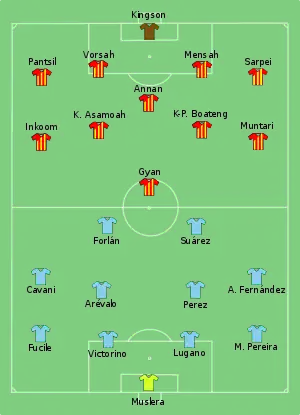 در دومین دیدار از مرحله یک چهارم نهایی جام جهانی فوتبال ۲۰۱۰، تیم ملی اروگوئه، در ضربات پنالتی بر غنا غلبه کرد تا راهی مرحله نیمه نهایی جام جهانی شود. بازی تیمهای اروگوئه و غنا با حضور ۸۴ هزار نفر در ورزشگاه ساکر سیتی شهر ژوهانسبورگ و به داوری اولگاریو بنکوئرنکا از پرتغال برگزار شد.[4]