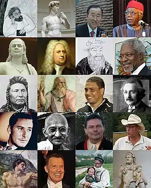 ![]() چپ به راست از بالا: حافظ • داوود • بان کیمون • چینوآ آچهبه • آریابهاتا • هندل • کنفوسیوس • کوفی عنان • چیف جوزف • افلاطون • رونالدو • آلبرت اینشتین • ارول فلین • گاندی • اوله هندریک مگا • جوال سَلَتین • میکلآنژ • اریک شینگر • یک مرد و بچه - هرکول |