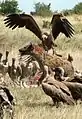 کفتارهای خالدار در حال جنگیدن با کرکسها برای تصاحب یک لاشه. کفتارها از جمله بزرگجثهترین مردارخوارانند.