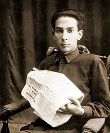 ![]() محب، شاعر پارسیگوی یهودی، با هفتهنامه روشنایی چاپ سمرقند در دست، در اواخر دهه ۱۹۲۰ | |