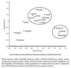 مطابق با این گراف نزدیکترین گروه به ایرانیان، یونانیان هستند با ۰٫۰۰۷۰ اختلاف پس از ایشان به ترتیب ۰٫۰۱۳۳ مردمان ایتالیا و ۰٫۰۱۵۲ هندوستان، خاور نزدیک ۰٫۰۱۵۴، دانمارکیها ۰٫۰۱۷۹ و انگلیسیها ۰٫۰۱۹۷ قرار دارند و همینطور میزان خویشاوندی ایرانیان با زردپوستان ترک و اقوام تورکیک (با علامت اختصاری ان تی یو در گراف) ۰٫۰۸۲۱ است که اختلاف زیادی را نمایش میدهد.
