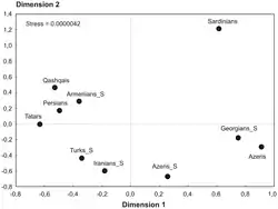 مطالعات ژنتیکی دیگر در مورد ارمنیها قوم همسایه هندواروپایی زبان آذربایجانیها هم نشان داده که شباهت ژنتیکی آنها هم در نسب مادری و هم در نسب پدری به همسایگان قفقازی بیشتر از همزبانان هندواروپایی است. خصوصیات ژنتیکی قفقازیها نیز در مجموع چیزی بین اروپائیها و ساکنان خاورمیانهاست که نسب مادری شباهت بیشتری را به اروپائیها و نسب پدری شباهت بیشتری را به خاورمیانهایها نشان میدهد. این نتایج ایده جابجایی زبانی آذربایجانیها را تقویت میکند و نشان میدهد که گروههای مهاجر آن قدر کوچک بودهاند که سهم ژنتیکی آنها در جمعیت فعلی قابل مشاهده نیست.[98][99][100][101] مطالعات دپارتمان ژنتیک دانشگاه کمبریج به علاوه همین امر، تمایز و فاصله ژنتیکی مردمان آذری با تُرکهای آناتولی و اروپا را نیز نشان میدهد.[102] طی تحقیقی که در سال ۱۳۸۹ روی جمعیتهای ساکن در ایران انجام شد، سهم هاپلوگروپ منتسب به اقوام آریایی در کل جمعیت ایران فقط ۱۰/۲ درصد بدست آمد،[103] در مقیاس و مقایسه جهانی، جمعیت ایران از لحاظ شباهت کروموزوم Y (نسب پدری) از یک سو به هندوها و پاکستانیها و از سوی دیگر به مردمان آسیای میانه و همچنین کشورهای خاورمیانه نزدیکی و قرابت دارد.[103] بر مبنای یک مقاله منتشر شده در سال ۲۰۱۳، که مقایسهای است در مورد ساختار ژنتیکی ۳۵۲ ایرانی، با وجود اینکه تنوع ژنتیکی کل ایرانیان بسیار بالا است، آذریهای ایران قرابت ژنتیکی نزدیکتری با مردم گرجی در مقایسه با گروههای ایرانی، ترکیه ای و همچین آذریهای قفقاز دارند. برخلاف تصور موجود که فرض میشود که آذربایجانیها (ساکنان امروزی کشور جمهوری آذربایجان) با آذریهای ایرانی ریشه مشترک دارند، تحقیقات نشان میدهد که آذریهای ناحیه قفقاز ویژگی ژنتیکی متفاوتی از آذریهای ساکن ایران دارند و موقعیتی میان آذری ها/گرجیها از یک سو و ایرانی ها/ترکها از سوی دیگر دارند.[104] باور غالب دانشمندان بر این است که آذربایجانیهای امروز از نسل آلبانیای قفقاز[105][106] و اقوام ایرانی تباری هستند که در قفقاز و شمال ایران قبل از ترک سازی میزیستند. مورخان از جمله ولادیمیر مینورسکی دربارهٔ ترکسازی مردمان قفقاز و ایرانیها مینویسد: