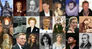 ردیف دوم: الیزابت اول انگلستان • بابی مور • مارگارت تاچر • دیوید بکام • هارولد گاودینسون • کیت وینسلت • چارلز دیکنز ردیف سوم: پاپ آدریان چهارم • دانیل کریگ • اسحاق نیوتن • جرج هریسون • جین آستن • دیمون آلبارن • جورج استفنسون | ||||||||||||