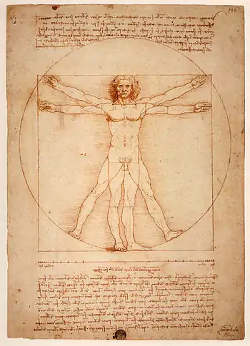 مطابق مشاهدات لئوناردو دا وینچی در متن تصویر، که بهصورت قرینه نوشته شدهاست، نقاشی بهعنوان توصیفی از تناسبهای موجود در بدن انسانِ مذکر در قالب بدنِ ویترویوس کشیده شدهاست: