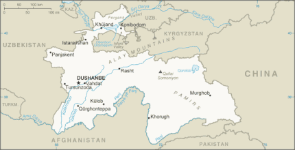 نقشه کشور تاجیکستان که مرز آن با قرقیزستان مشخص است.