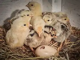 در پایان دورهٔ جوجه کشی که معمولاً ۲۱ روز است، تخمها در صورت بارور بودن، هچ hatch میشوند. با شروع انکوباسیون رشد جنین هم آغاز میشود و همهٔ تخمها با یک یا حداکثر دو روز اختلاف هچ میشوند؛ اگر چه تاریخ گذاشته شدن تخمها تا دو هفته هم با یکدیگر اختلاف داشته باشند. قبل از هچ شدن مرغ میتواند صدای جوجهها را در تخم شنیده و با قدقد کردن آنها را تشویق به بیرون آمدن میکند. جوجهها با نوک خود سوراخی را جهت تنفس خود در قسمت پهن تخم که معمولاً در بالای سر جوجه قرار میگیرد، ایجاد میکنند. سپس برای چند ساعت استراحت کرده، به جذب زرده (yolk) و بقایای خون پوسته که در پایین تخم است و تا پیش از این برای تنفس جوجه بکار میرفت، میپردازد. پس از آن به گشاد کردن سوراخ و ایجاد یک در، در قسمت پهن تخم اقدام میکند و پس از موفقیت خود را به بیرون میغلطاند و در گرمای بستر بدن خیسش خشک میشود.