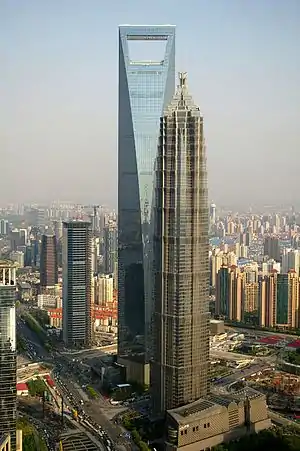 برج مرکز مالی جهانی شانگهای در این تصویر در پشت برج جین مائو دیده میشود.