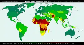 میزان مرگومیر نوزادان در سرتاسر جهان در سال ۲۰۰۸ بر اساس آمار سیا (در سال ۲۰۰۸) ۴۲٫۶۴ و بر اساس آمار سازمان ملل متحد (در سال ۲۰۰۶) ۴۹٫۴ بوده است. این آمار از ۱۲۶ در سال ۱۹۶۰ به ۵۷ در سال ۲۰۰۱ کاهش داشته است[2].