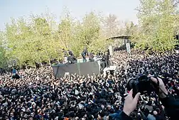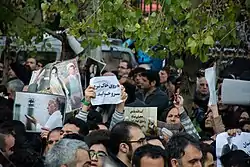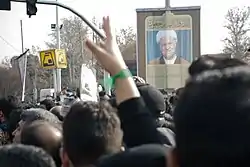 دستنوشته و پوسترهای مردم شرکتکننده در مراسم تشییع در مقابل دانشگاه تهران - سید علی سیستانی در پیامی به محمد هاشمی درگذشت برادر را تسلیت گفت.[31]