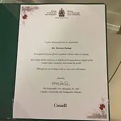 «آقای مرتضی پاشایی؛ باعث خوشحالی من است که مراتب قدردانی ام را به پاس کوششهای شما برای پیشبرد فرهنگ ایرانی در کانادا ابراز کنم. استعداد منحصر به فرد شما موجب شهرت شما به عنوان یک افسانه در جامعه موسیقی ایرانی و سراسر جهان شد، که سزاوار آن بودید. اگر چه شما دیگر با ما نیستید، صدایتان همچنان باقی است.