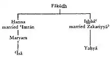 قرآن مریم را «دختر عمران» میخواند[5] و در آن ذکر میکند که مردم او را «خواهر هارون» خواندهاند.[6] مادر وی که در قرآن فقط به عنوان همسر عمران از او یاد شده، برای فرزندی دعا کرد و سرانجام باردار شد.[7] به گفته محمد بن جریر طبری، مادر مریم حنا نام داشت و عمران، شوهرش، قبل از تولد کودک (مریم) درگذشت. حنا با انتظار برای پسر بودن کودک، قول داد که کودک را به انزوا و خدمت در معبد اختصاص دهد. با این حال، حنا در عوض دختری به دنیا آورد و نام او را ماری (مریم) گذاشت.[8]
