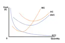 متوسط هزینه های ثابت:برای محاسبه این نوع هزینه،تمام هزینه های ثابت یک شرکت را جمع کرده و بر مقدار تولید تقسیم کنید (AFC = FC / Q). این مقدار به ازای افزایش حجم تولید ،به طور مداوم کاهش می یابد.این منحنی به ندرت کشیده می شود زیرا فاصله دو منحنی ATC و AVC در هر نقطه از نمودار برابر AFC خواهد بود.